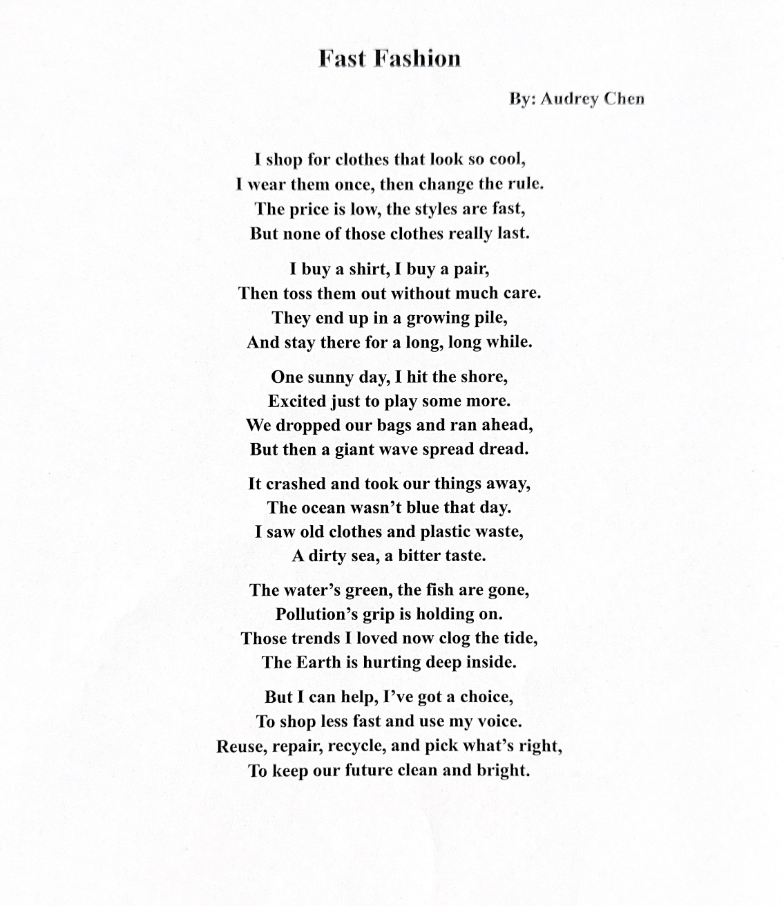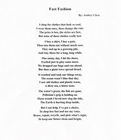 Audrey Chen – Fast Fashion (Age 7-10, Poetry)
